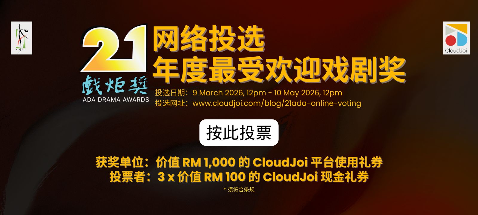 日期 16/5/2026 Saturday 时间 :6.00pm 剧场人 & 嘉宾 茶点(只限受邀者) 8.00pm 颁奖典礼晚会 地点: D Theatre, Empire CIty, Damansara, PJ (Zon 4) 出席领票 网页 https://www.cloudjoi.com/shows/5422-21st-ada-drama-awards#tickets