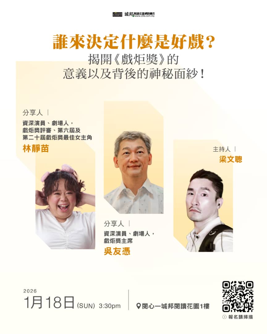 18.01.2026 誰來決定什麼是好戲? ~~揭開《戲炬獎》的意義以及背後的神秘面紗! 活动日期和时间: 我要报名 2026-01-18 (Sun) 15:30 活动地点: 閱心(城邦閱讀花園 1樓)1st Floor ,41, Jalan Radin Anum, Bandar Baru Sri Petaling, 57000 Kuala Lumpur. 活动内容: 我們邀請到大馬中文舞台劇標誌性頒獎典禮——戲炬獎的主席吳友憑以及評審林靜苗,接受主講人梁文聰的“毒舌拷問”,爲大家揭秘大獎的驚奇內幕,以及笑談這些年來的風風雨雨、好玩的故事。 讲师简介: 分享人 | 吳友憑——資深演員、劇場人,戲炬獎主席 林靜苗——資深演員、劇場人,戲炬獎評審、第六屆及第二十屆戲炬獎最佳女主角 主持人 | 梁文聰
